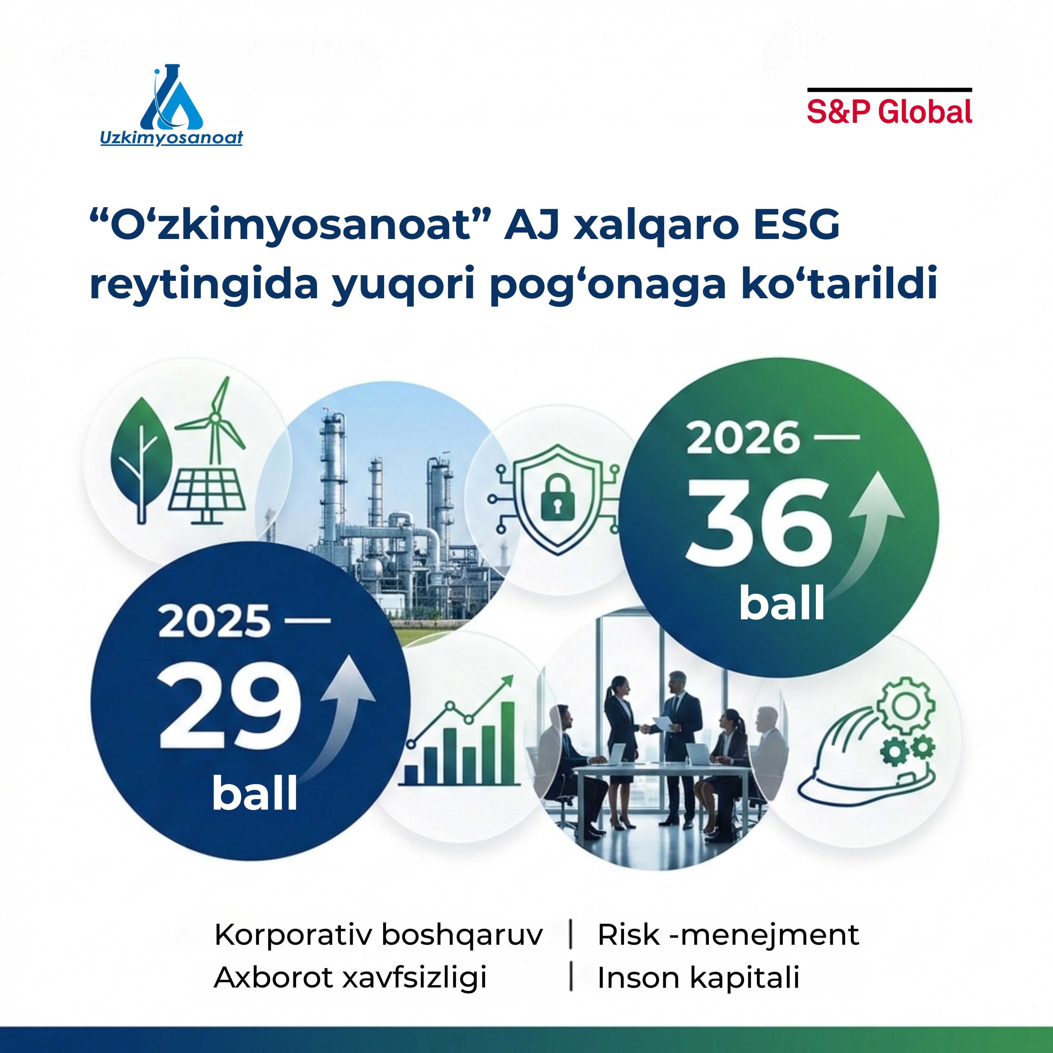 In accordance with the requirements of the Presidential Decree No. PF-37 dated February 21, 2024, and within the framework of strengthening transparency and corporate governance standards at major state-owned enterprises, JSC “Uzkimyosanoat” carried out activities aimed at obtaining an international ESG rating.