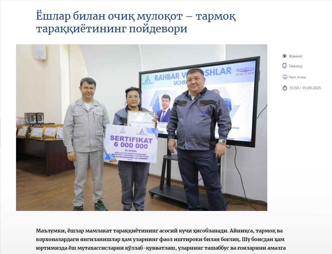 Ahamiyatlisi, yoshlar uchrashuvda o‘z taklif va savollari bilan to‘g‘ridan-to‘g‘ri rahbariyatga murojaat qilish imkoniyatiga ega bo‘ldi. Ayniqsa, ish sharoitlarini yaxshilash, malaka oshirish imkoniyatlarini kengaytirish, moddiy va ma’naviy rag‘batlantirish tizimini takomillashtirishga oid masalalar ilgari surildi. Shu bilan birga, yoshlarni oliy ta’lim bilan qamrab olish, tarmoqning boshqa korxonalari faoliyatini o‘rganish, ishlab chiqarish jarayoniga ilg‘or innovasion texnologiyalarni joriy etish kabi tashabbuslar bildirildi.