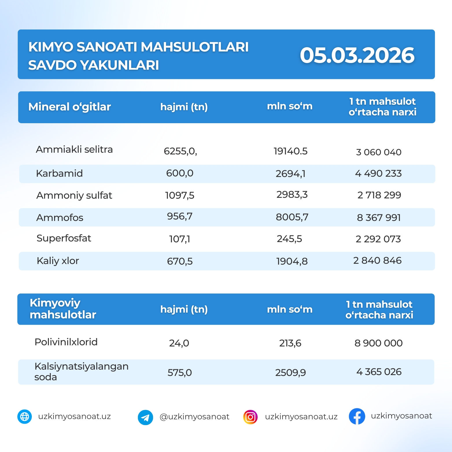 O‘zbekiston Respublika tovar-xom ashyo birjasidagi kimyo sanoati mahsulotlarining savdo yakunlari: 05.03.2026