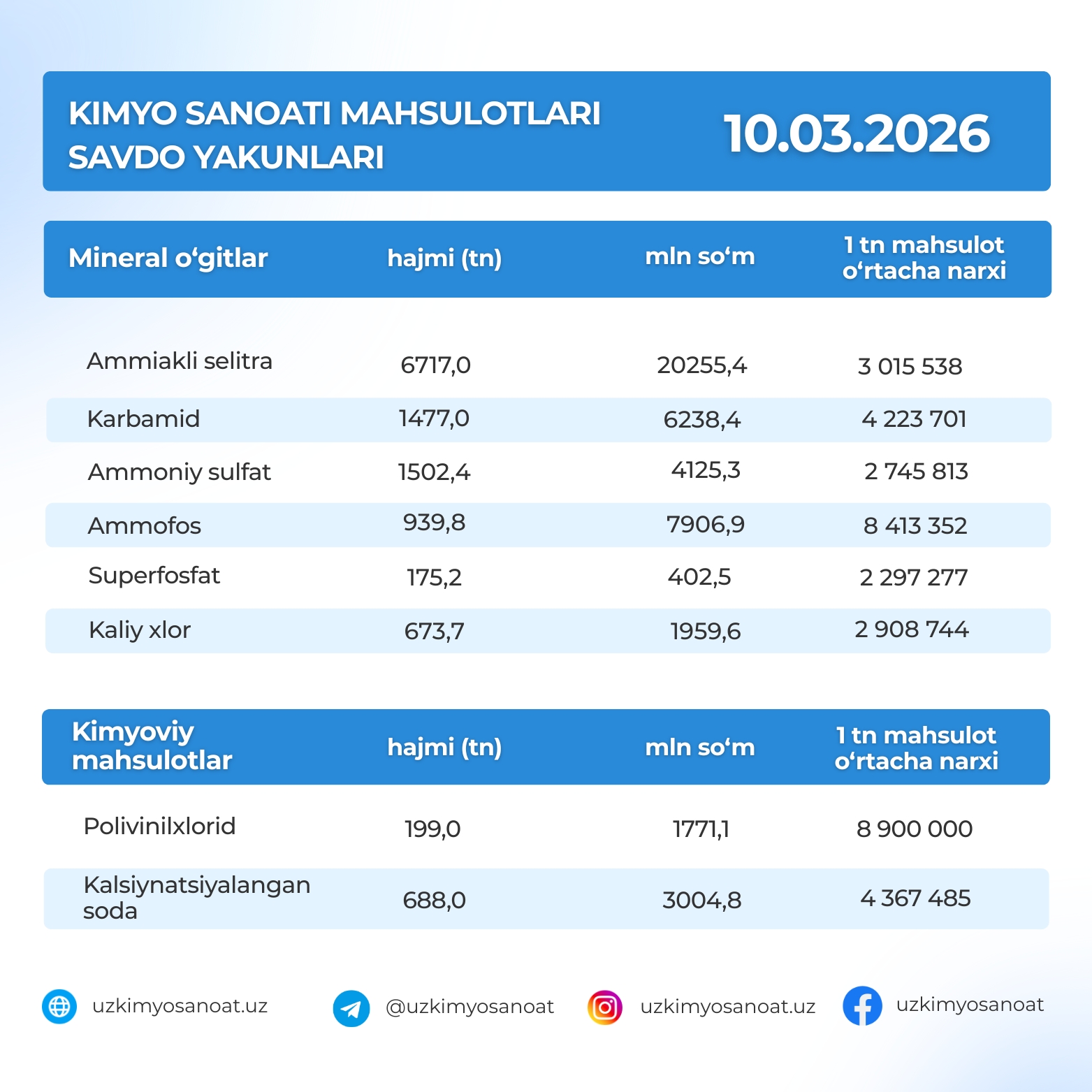 O‘zbekiston Respublika tovar-xom ashyo birjasidagi kimyo sanoati mahsulotlarining savdo yakunlari: 10.03.2026