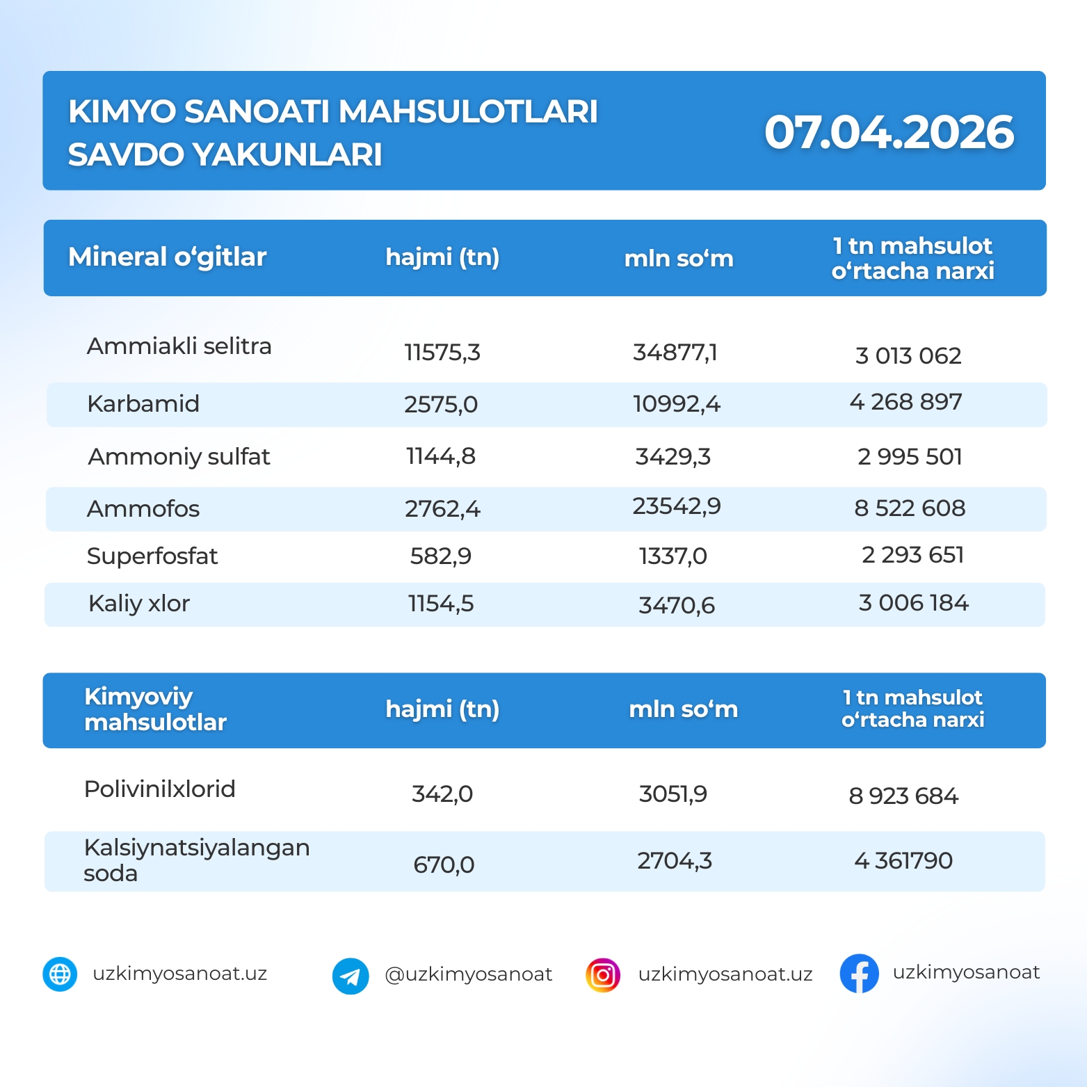 O‘zbekiston Respublika tovar-xom ashyo birjasidagi kimyo sanoati mahsulotlarining savdo yakunlari: 07.04.2026