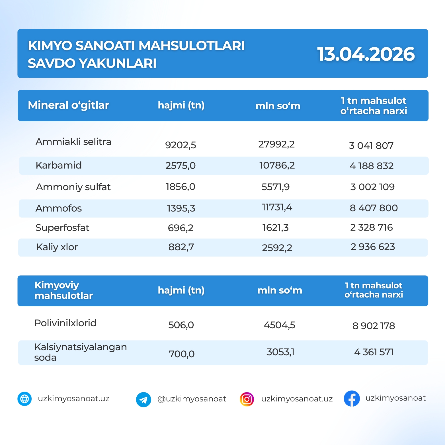 O‘zbekiston Respublika tovar-xom ashyo birjasidagi kimyo sanoati mahsulotlarining savdo yakunlari: 13.04.2026