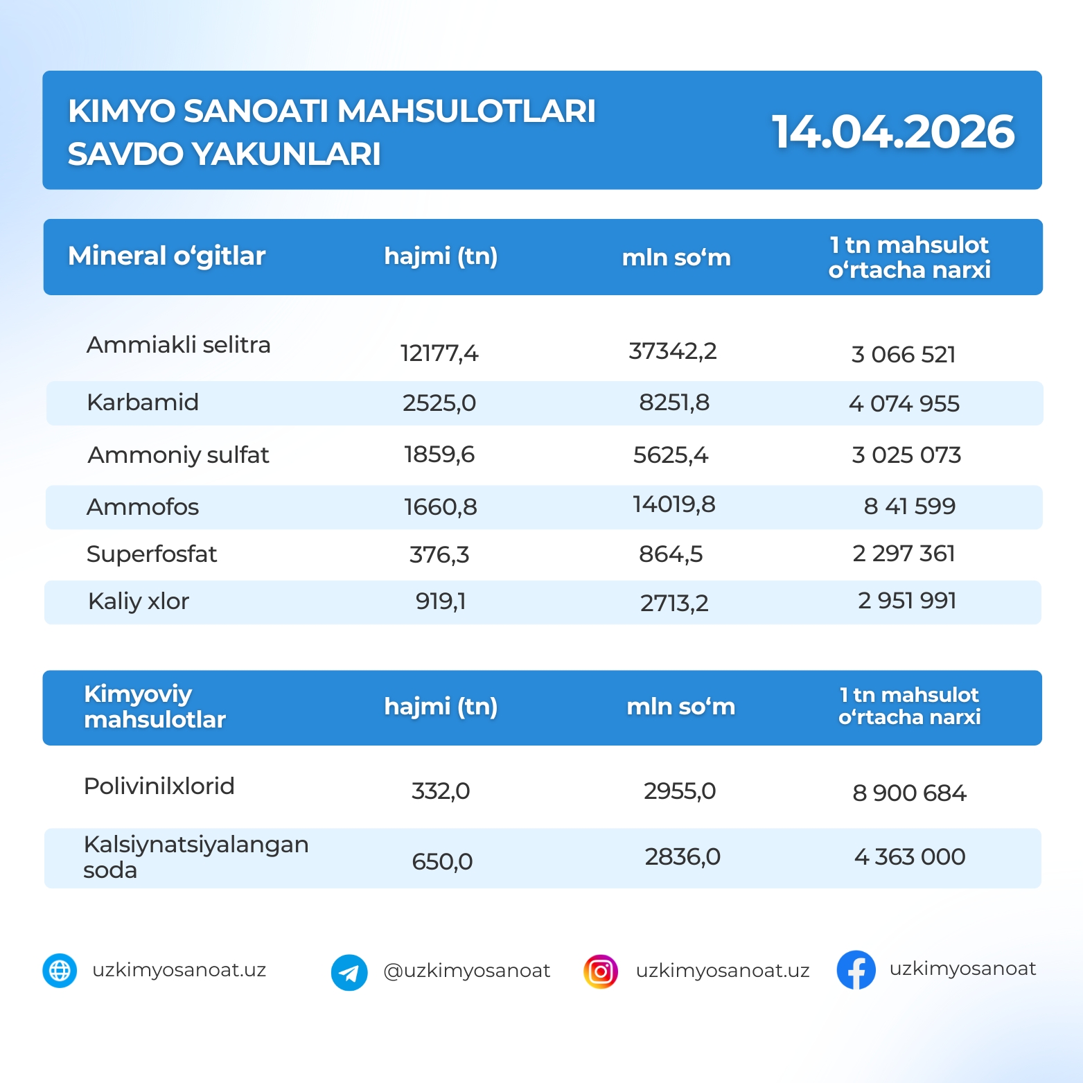 O‘zbekiston Respublika tovar-xom ashyo birjasidagi kimyo sanoati mahsulotlarining savdo yakunlari: 14.04.2026
