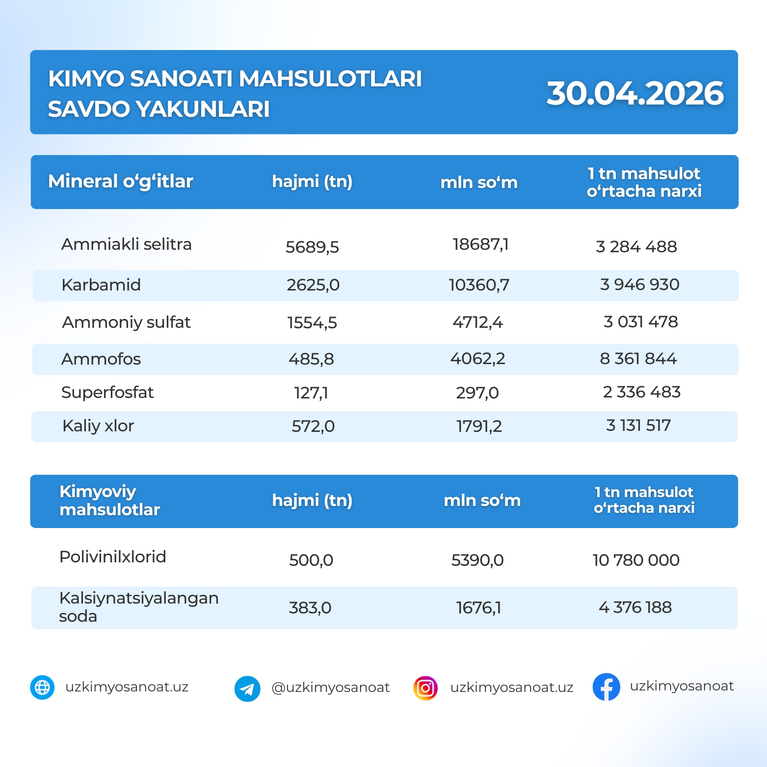 O‘zbekiston Respublika tovar-xom ashyo birjasidagi kimyo sanoati mahsulotlarining savdo yakunlari: 30.04.2026