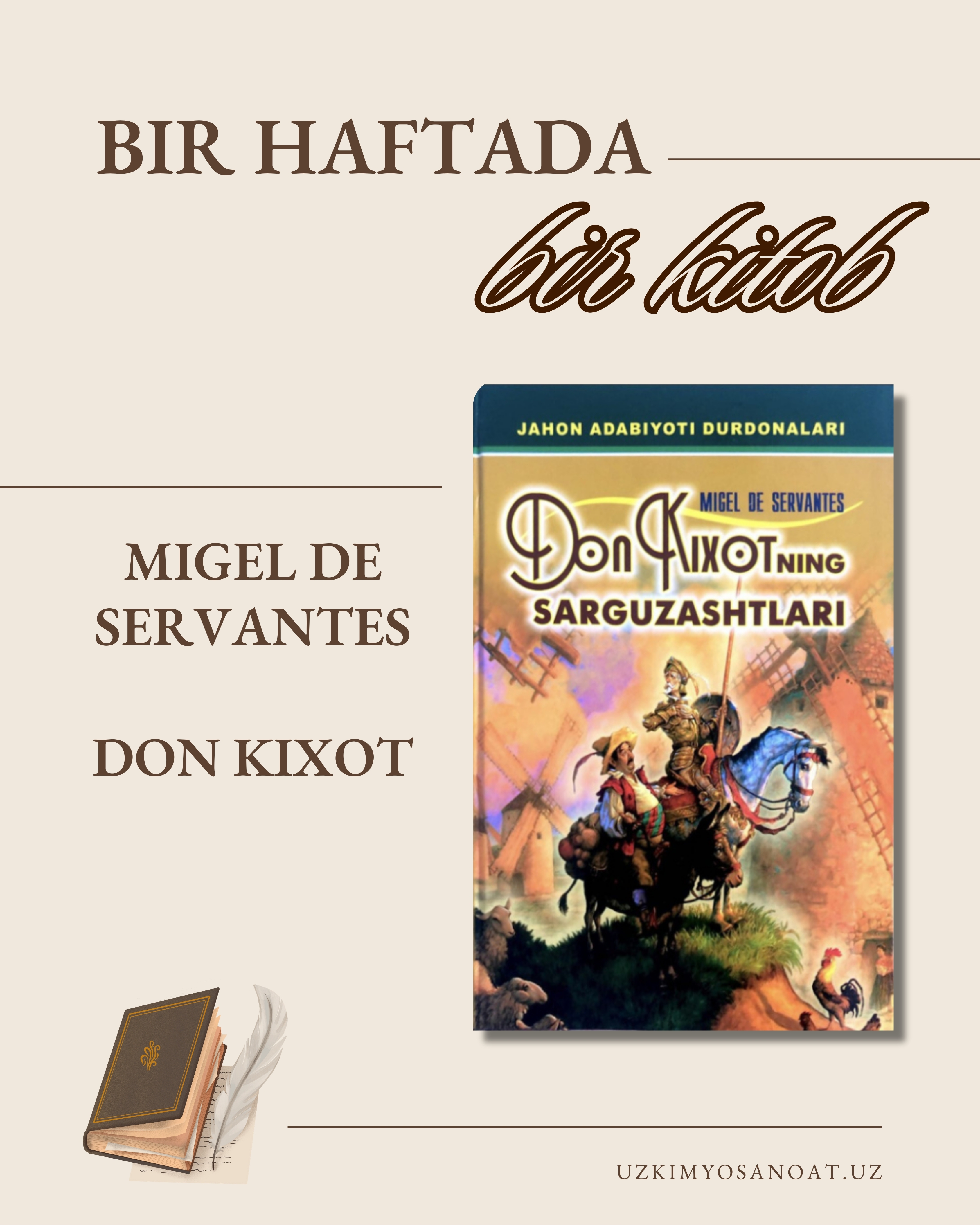 Bugun jahon adabiyotining eng nodir asarlaridan biri Migel de Servantes qalamiga mansub “Don Kixot” romanini tavsiya qilamiz.