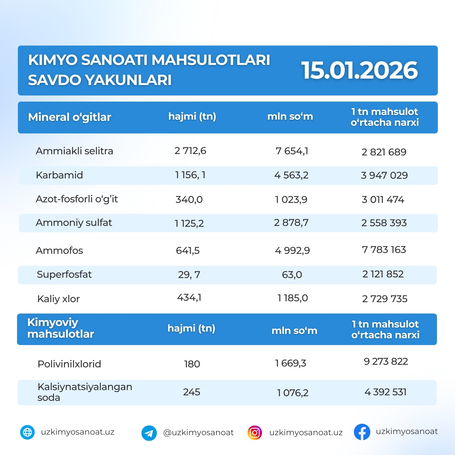 O‘zbekiston Respublika tovar-xom ashyo birjasidagi kimyo sanoati mahsulotlarining 15-yanvar kunidagi savdo yakunlari