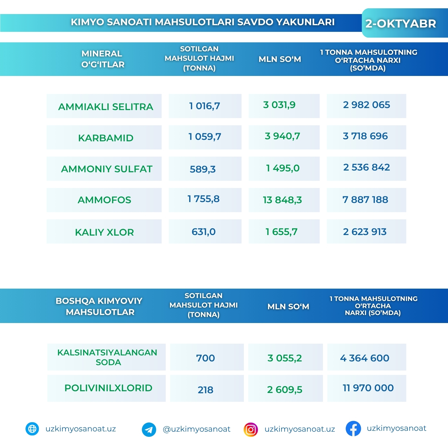Oʻzbekiston Respublika tovar-xom ashyo birjasidagi kimyo sanoati mahsulotlarining 2-oktyabr kunidagi savdo yakunlari