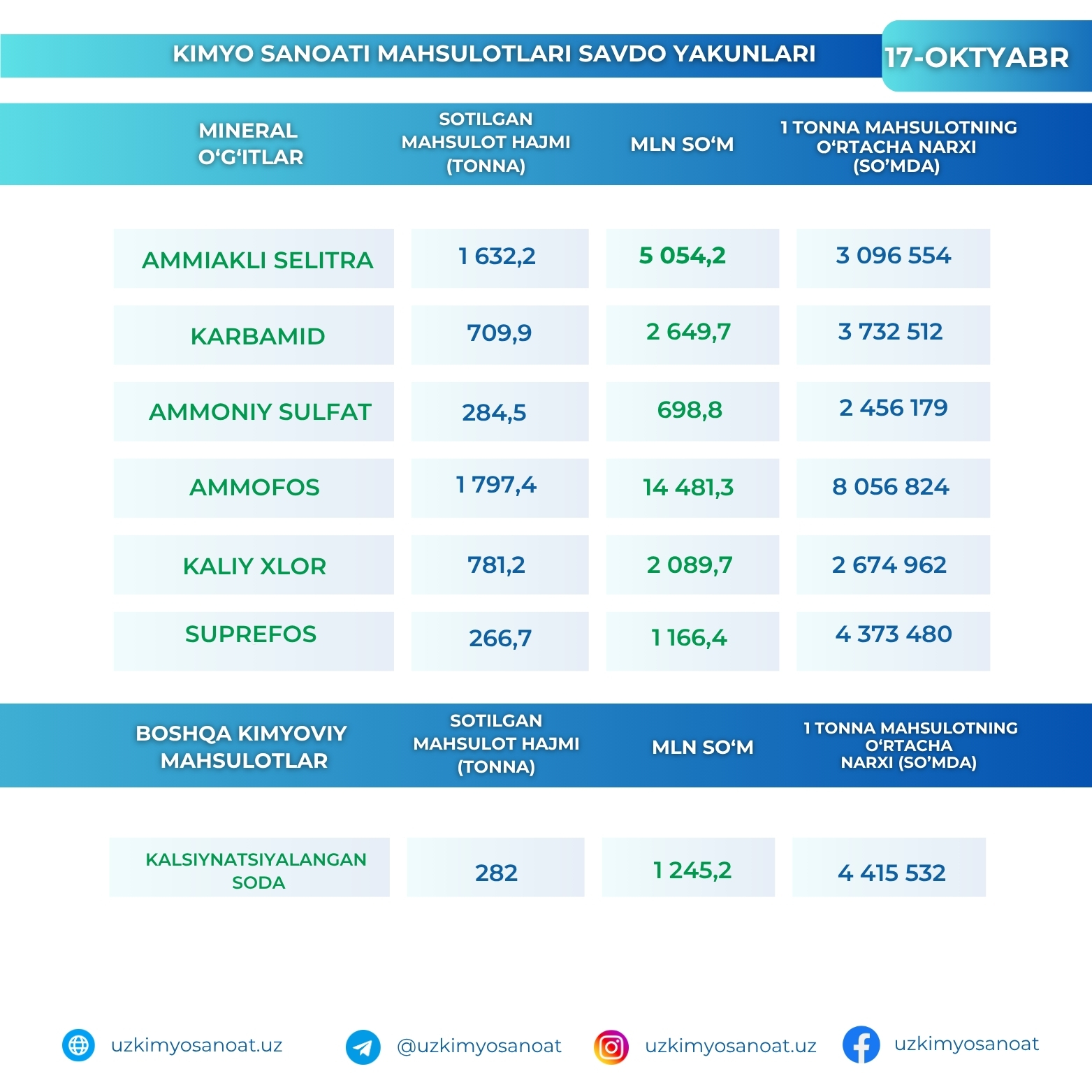 Oʻzbekiston Respublika tovar-xom ashyo birjasidagi kimyo sanoati mahsulotlarining 17-oktyabr kunidagi savdo yakunlari