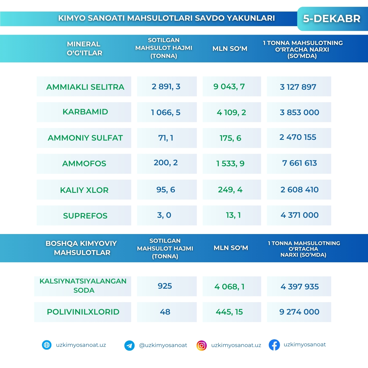 O‘zbekiston Respublika tovar-xom ashyo birjasidagi kimyo sanoati mahsulotlarining 5-dekabr kunidagi savdo yakunlari