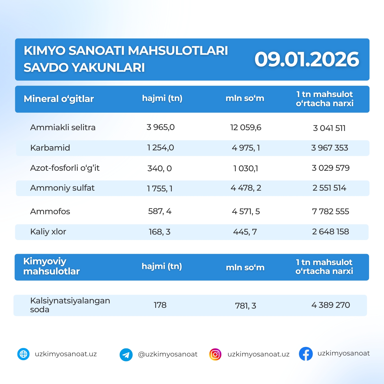 O‘zbekiston Respublika tovar-xom ashyo birjasidagi kimyo sanoati mahsulotlarining 2026-yil 9-yanvar kunidagi savdo yakunlari