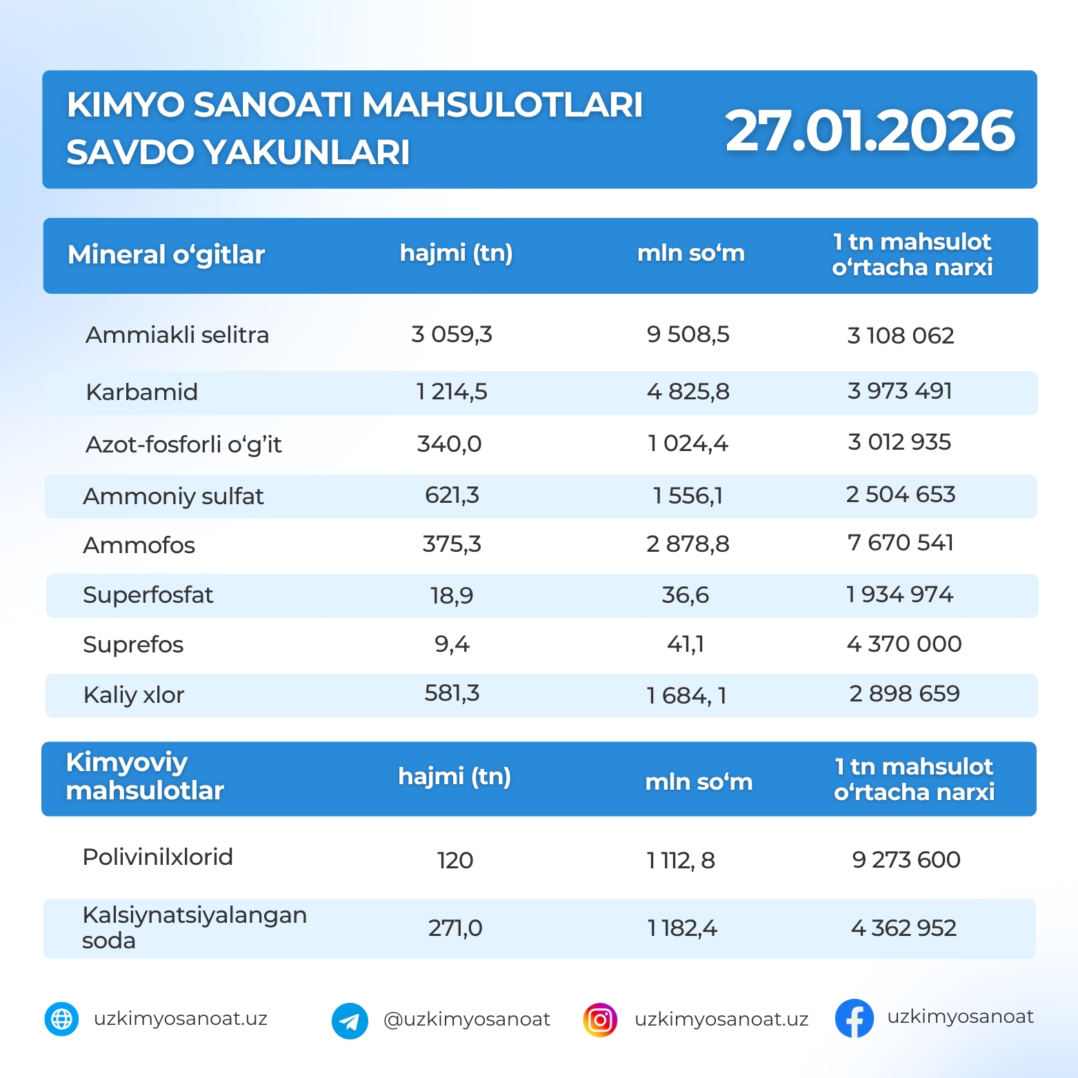O‘zbekiston Respublika tovar-xom ashyo birjasidagi kimyo sanoati mahsulotlarining 27-yanvar kunidagi savdo yakunlari
