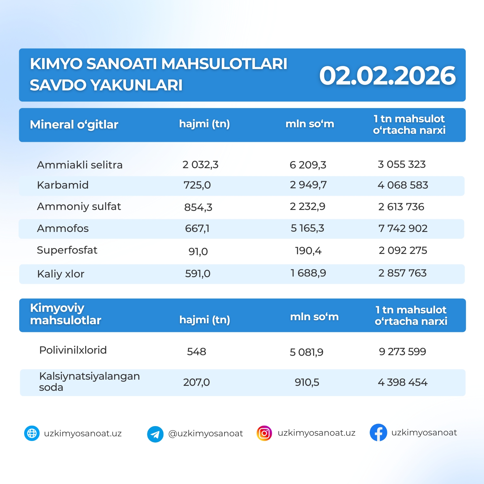 O‘zbekiston Respublika tovar-xom ashyo birjasidagi kimyo sanoati mahsulotlarining 2-fevral kunidagi savdo yakunlari