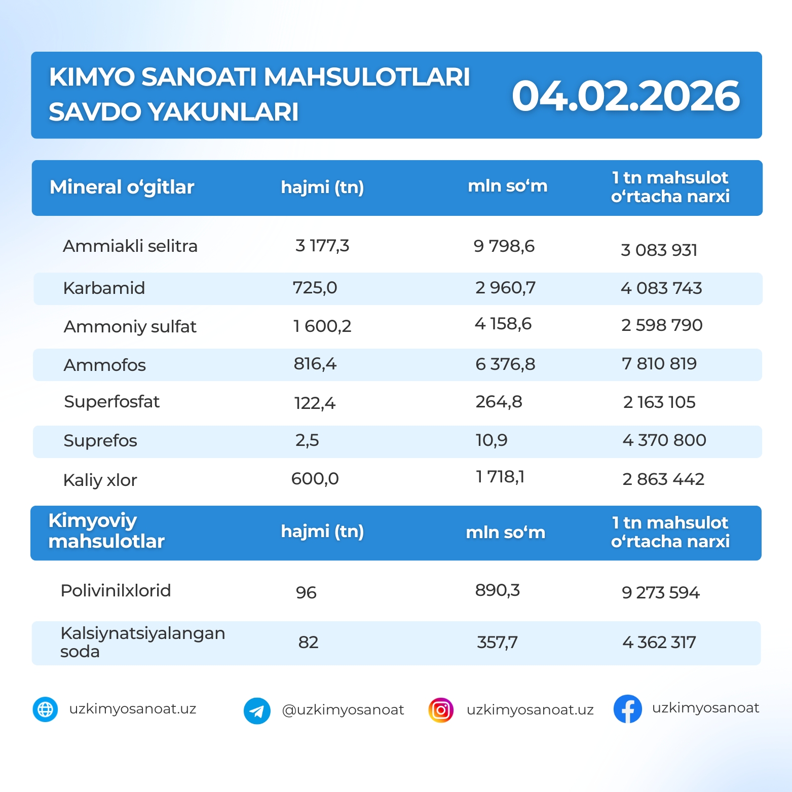 O‘zbekiston Respublika tovar-xom ashyo birjasidagi kimyo sanoati mahsulotlarining 4-fevral kunidagi savdo yakunlari