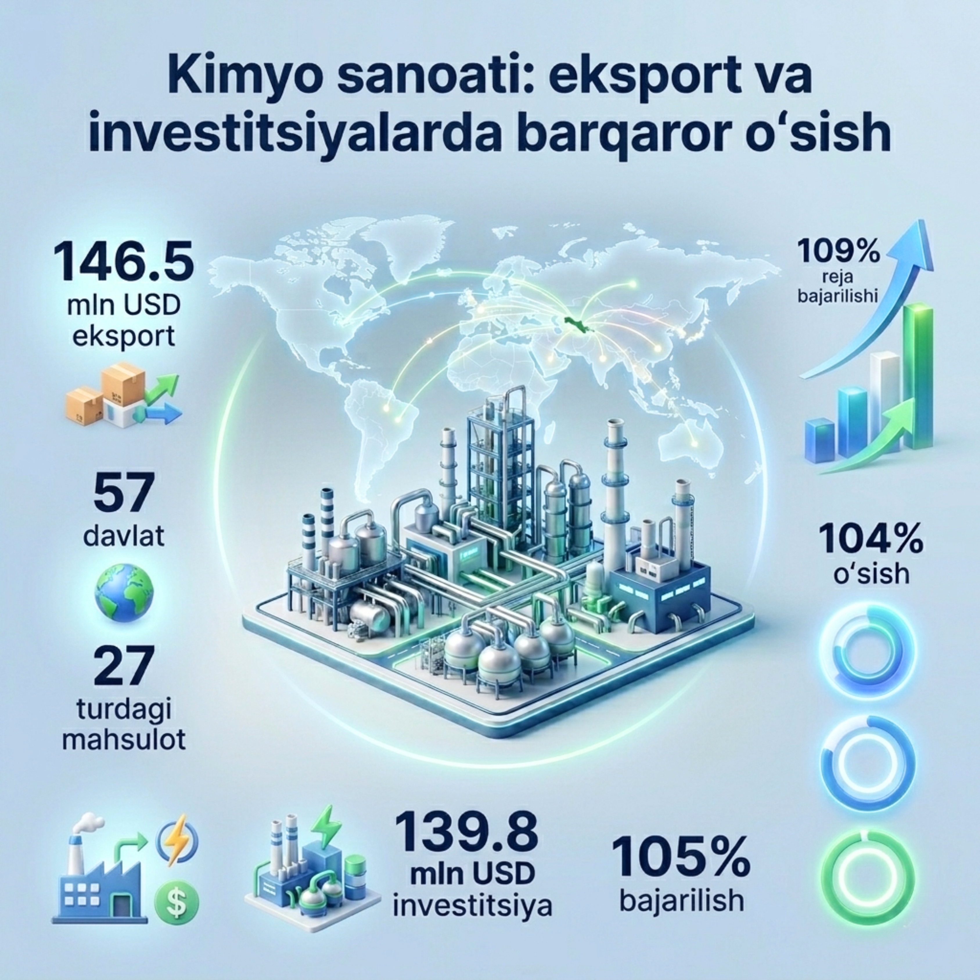 Mazkur koʻrsatkichlar kimyo sanoatida diversifikatsiya, qoʻshilgan qiymat zanjirini kengaytirish va eksport salohiyatini oshirish boʻyicha olib borilayotgan islohotlar samarasi hisoblanadi.