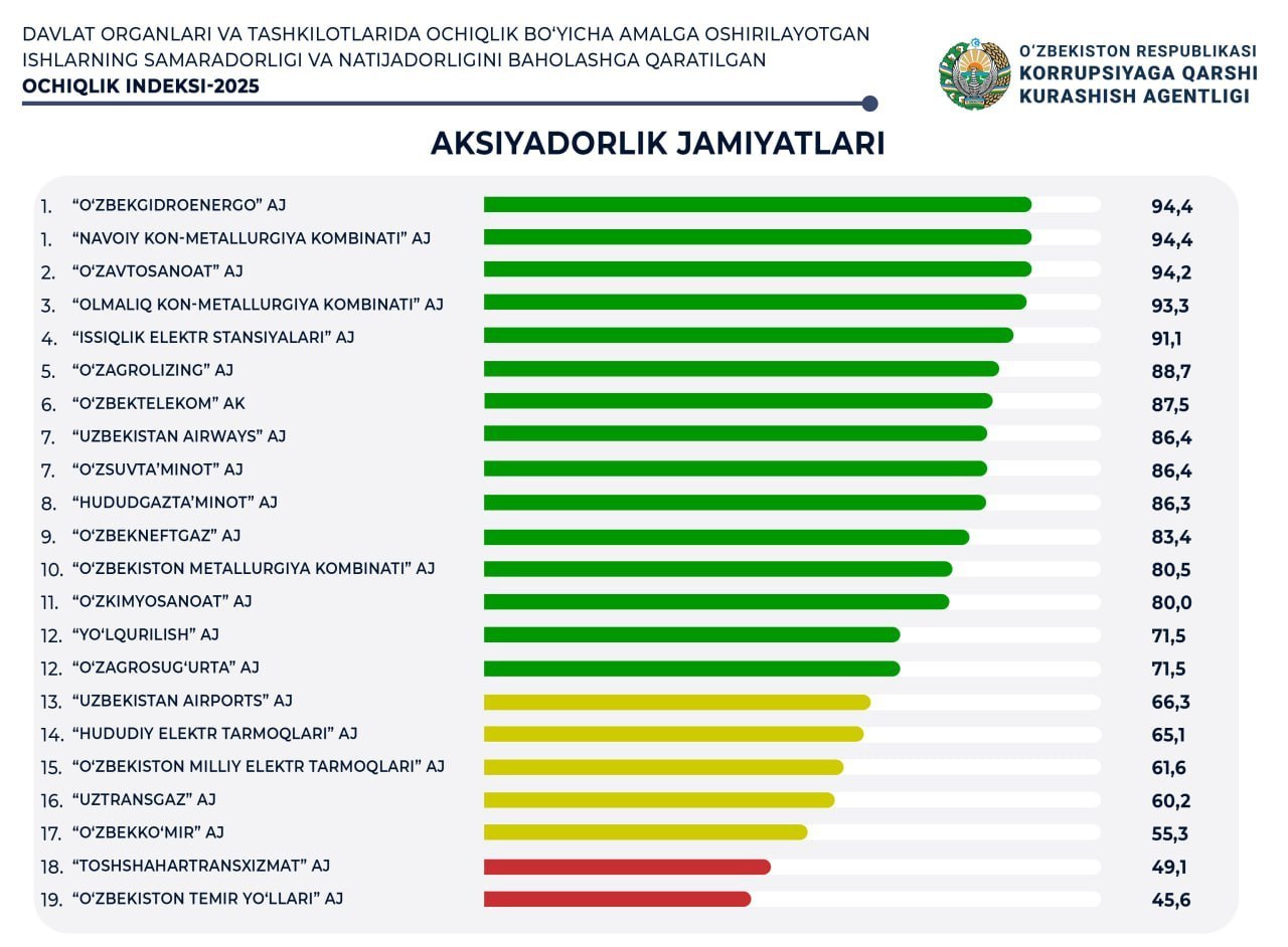 Ahamiyatlisi, mazkur reytingda “O‘zkimyosanoat” AJ 80,0 ball bilan yashil ko'rsatkichni qayd etdi.