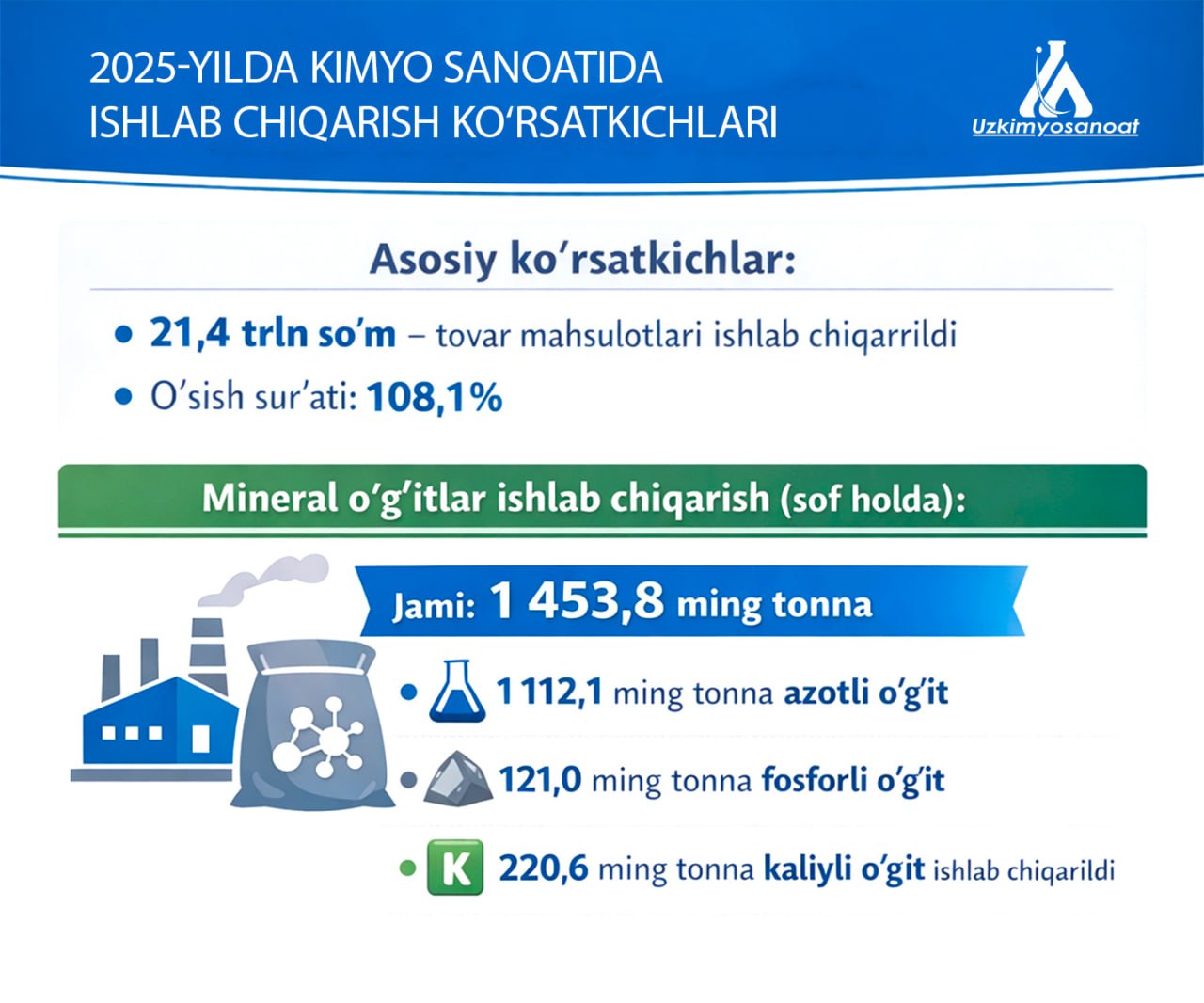 2025-yilda kimyo korxonalari tomonidan jami 21,4 trln so‘mlik tovar mahsulotlari ishlab chiqarildi. O‘sish sur’ati 108,1 foizga yetdi.