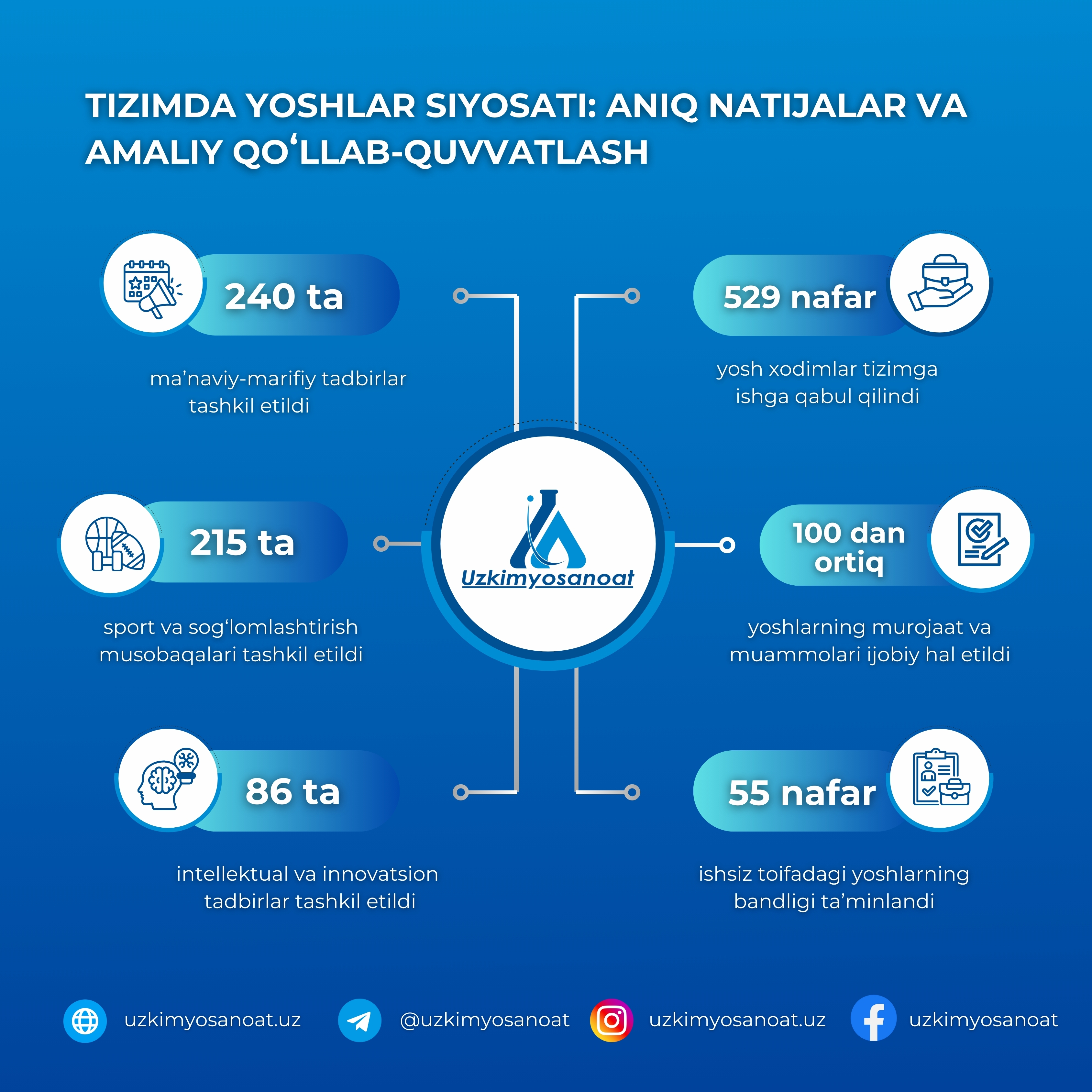 “Oʻzkimyosanoat” AJ yoshlarni qoʻllab-quvvatlash, ularning tashabbuslarini roʻyobga chiqarish va munosib ish oʻrinlari yaratish borasidagi ishlarini izchil davom ettiradi.
