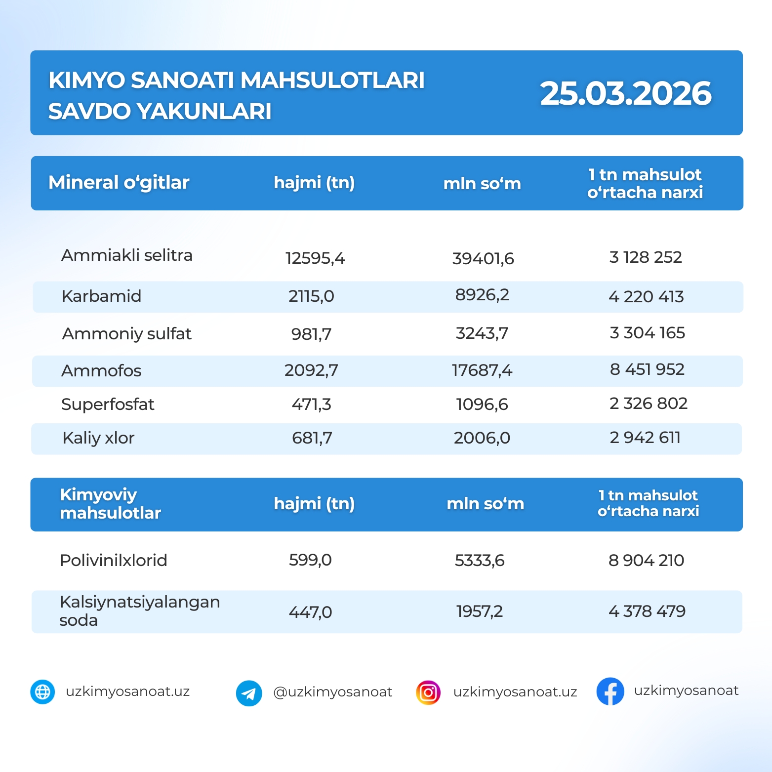 Итоги торгов продукцией химической промышленности на Узбекской республиканской товарно-сырьевой бирже: 25.03.2026