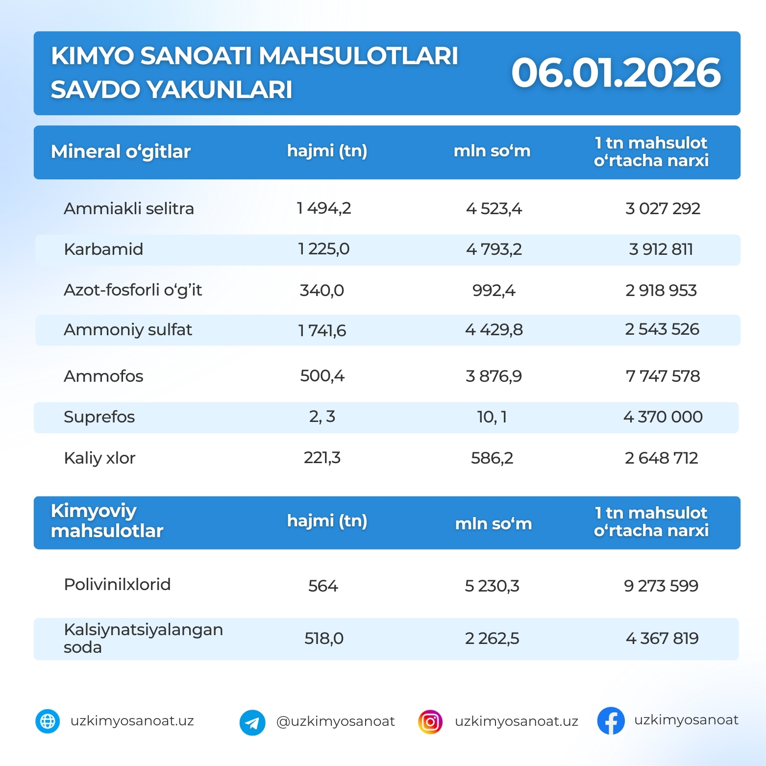 Итоги торгов продукцией химической промышленности на Узбекской республиканской товарно-сырьевой бирже за 6-января 2026 года