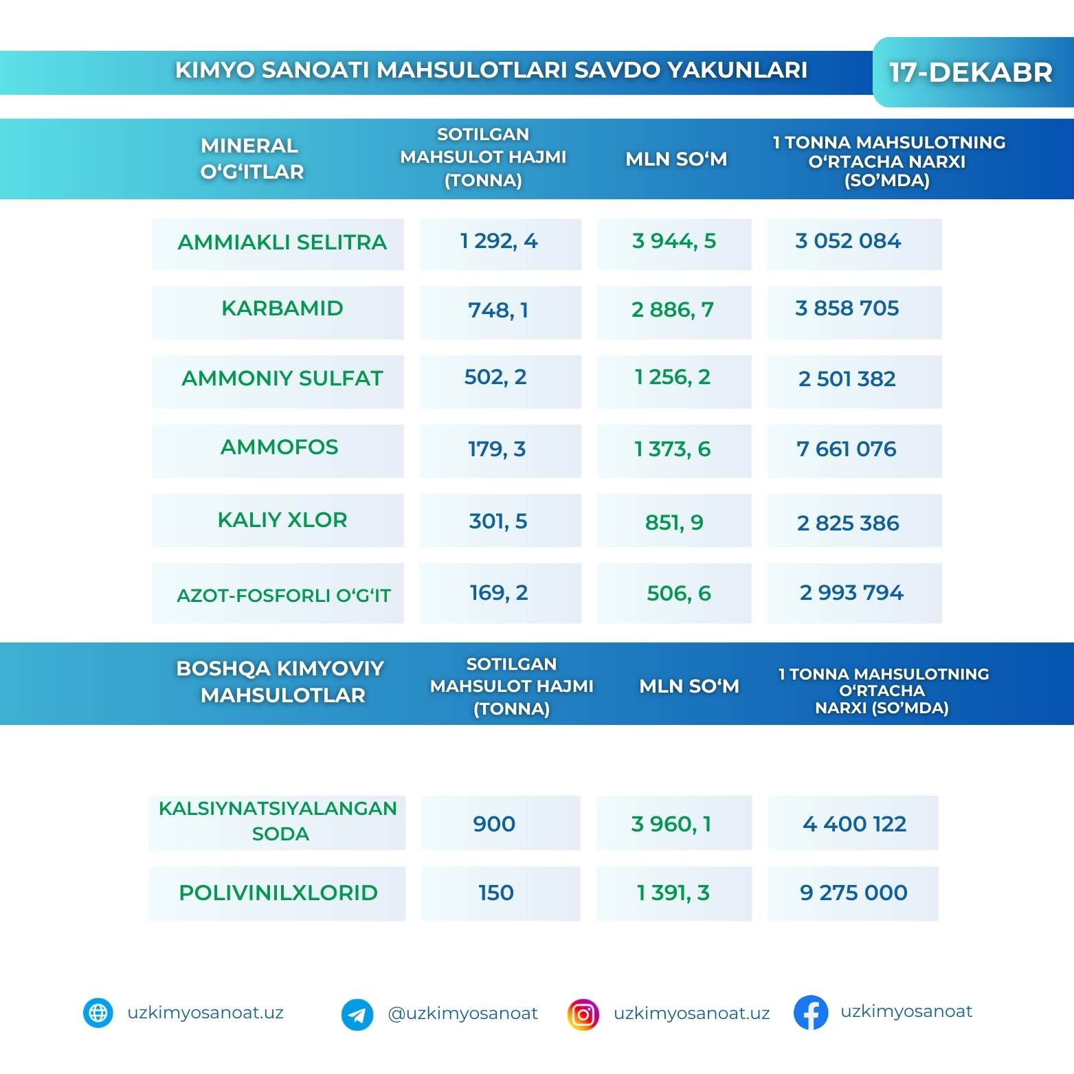 Итоги торгов продукцией химической промышленности на Узбекской республиканской товарно-сырьевой бирже за 17-декабря