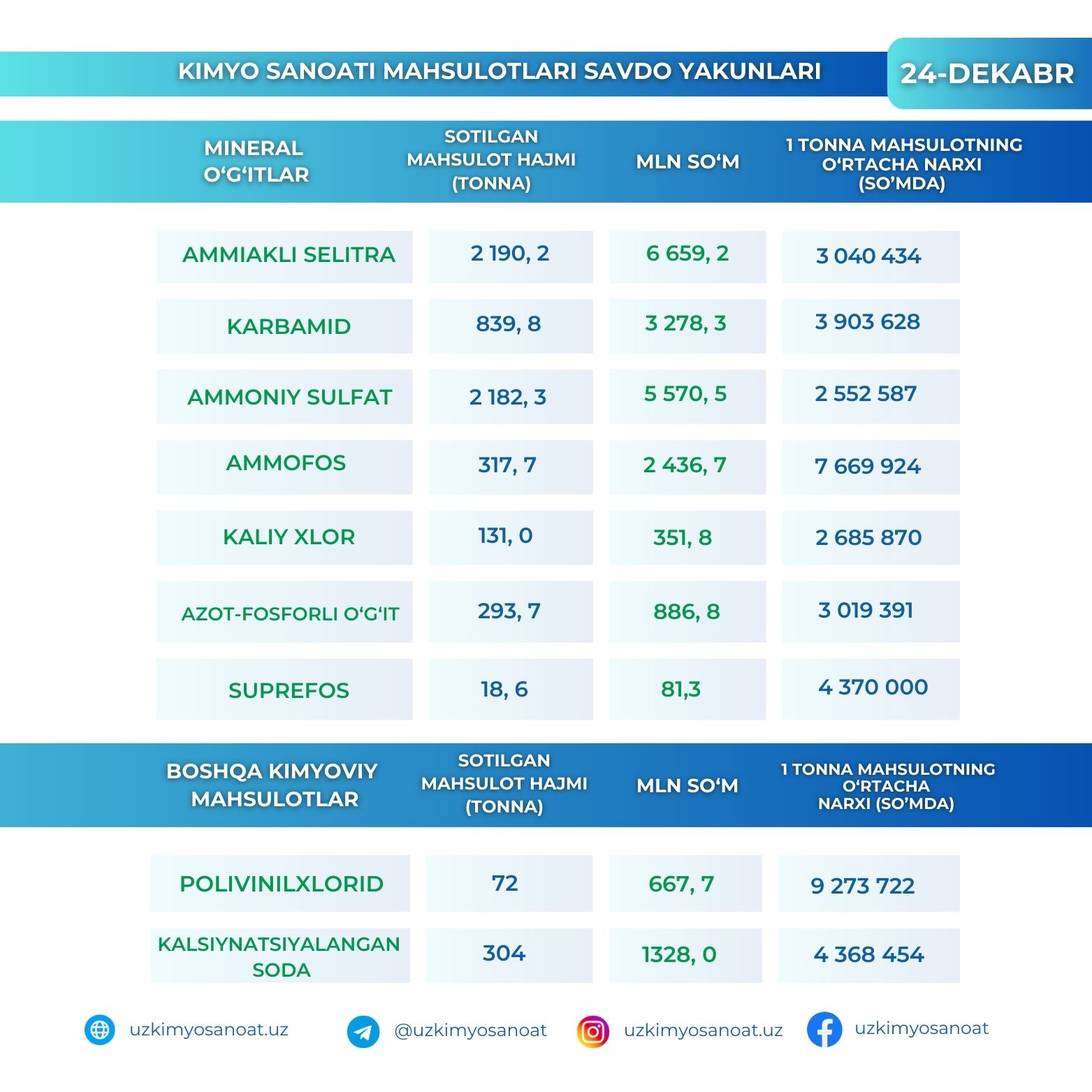 Итоги торгов продукцией химической промышленности на Узбекской республиканской товарно-сырьевой бирже за 24-декабря