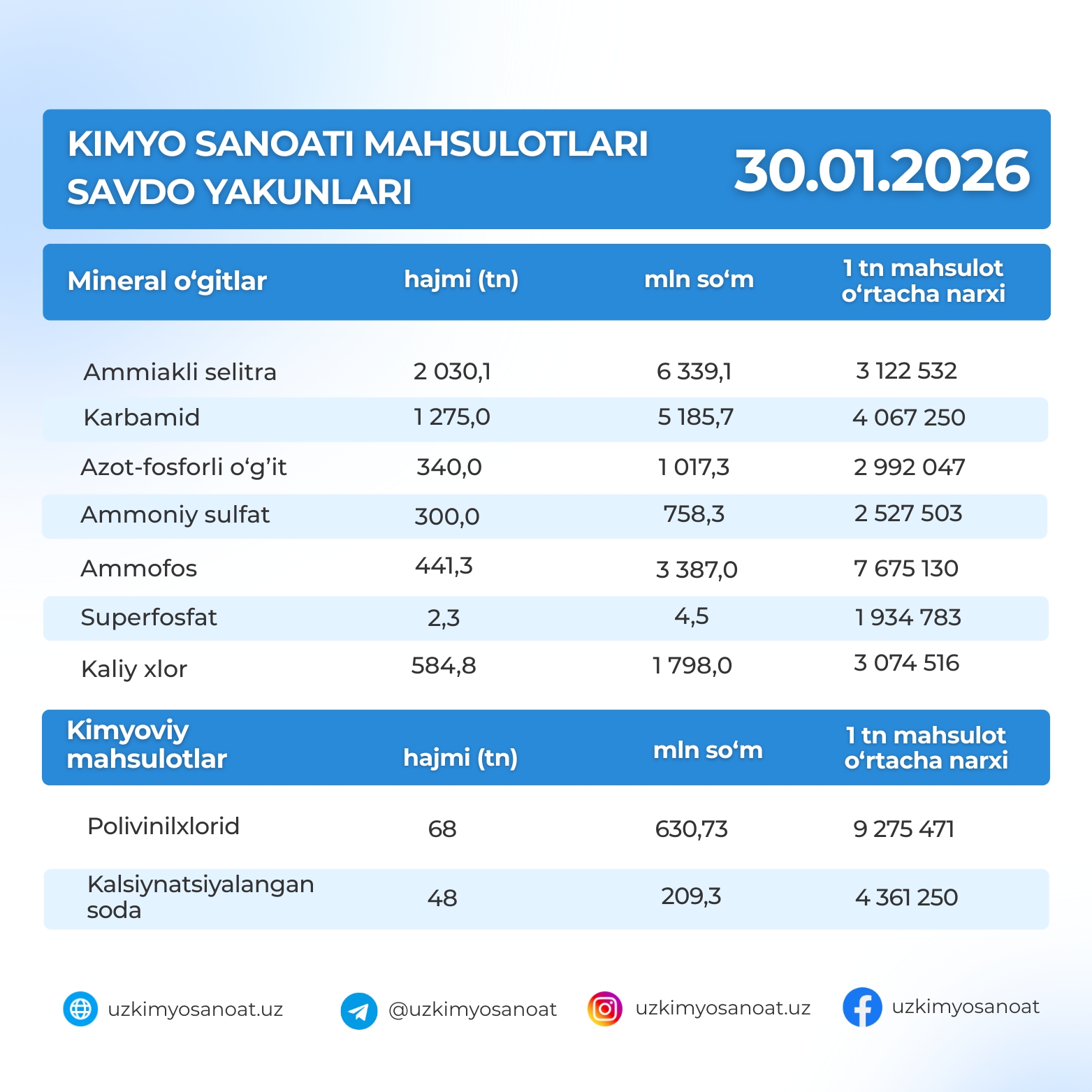 Итоги торгов продукцией химической промышленности на Узбекской республиканской товарно-сырьевой бирже за 30-января