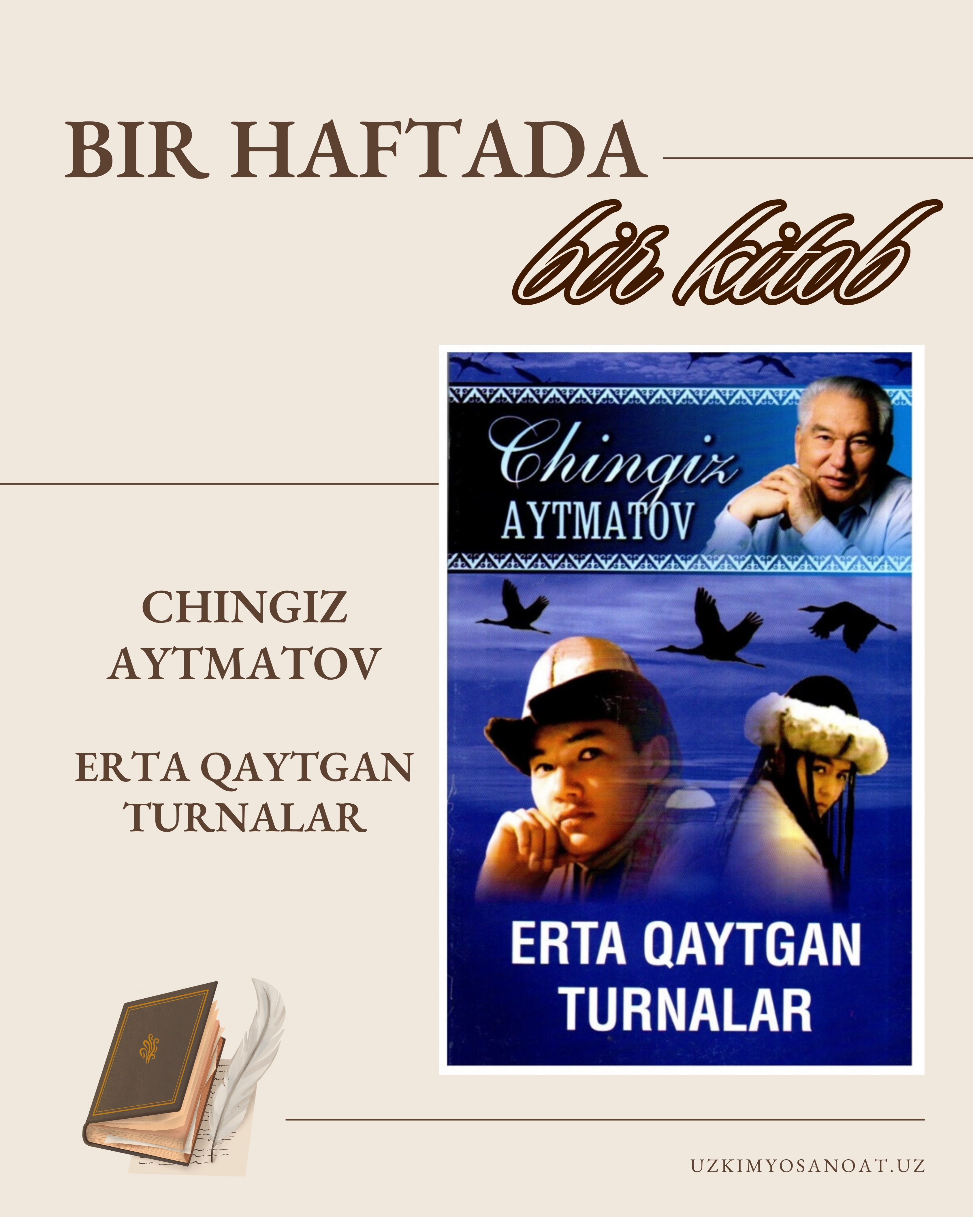 Бугун туркий халқлар адабиётининг забардаст ёзувчиси Чингиз Айтматовнинг “Эрта қайтган турналар” қиссасини тавсия қиламиз.
