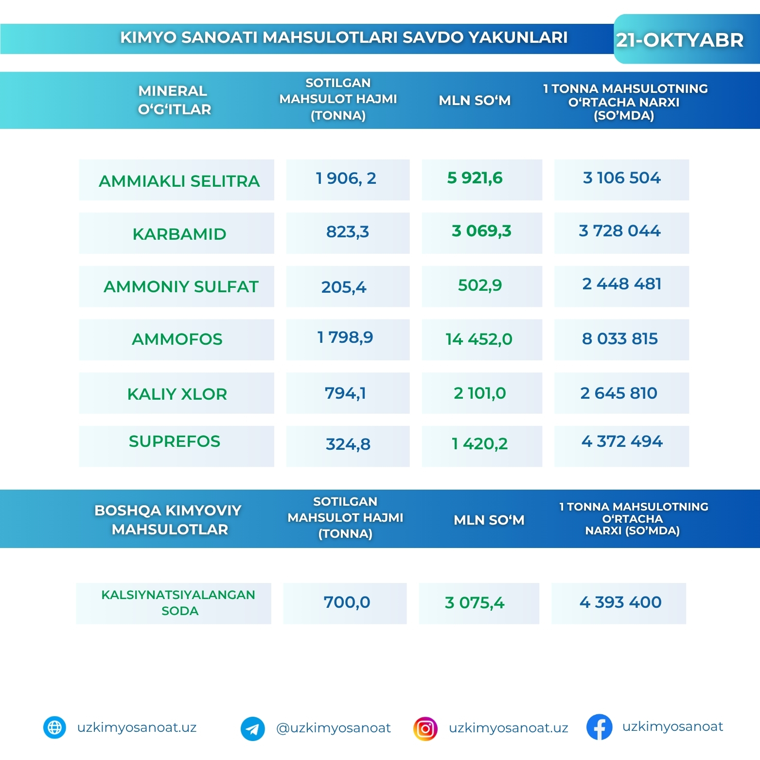 Ўзбекистон Республика товар-хом ашё биржасидаги кимё саноати маҳсулотларининг 21 октябр кунидаги савдо якунлари