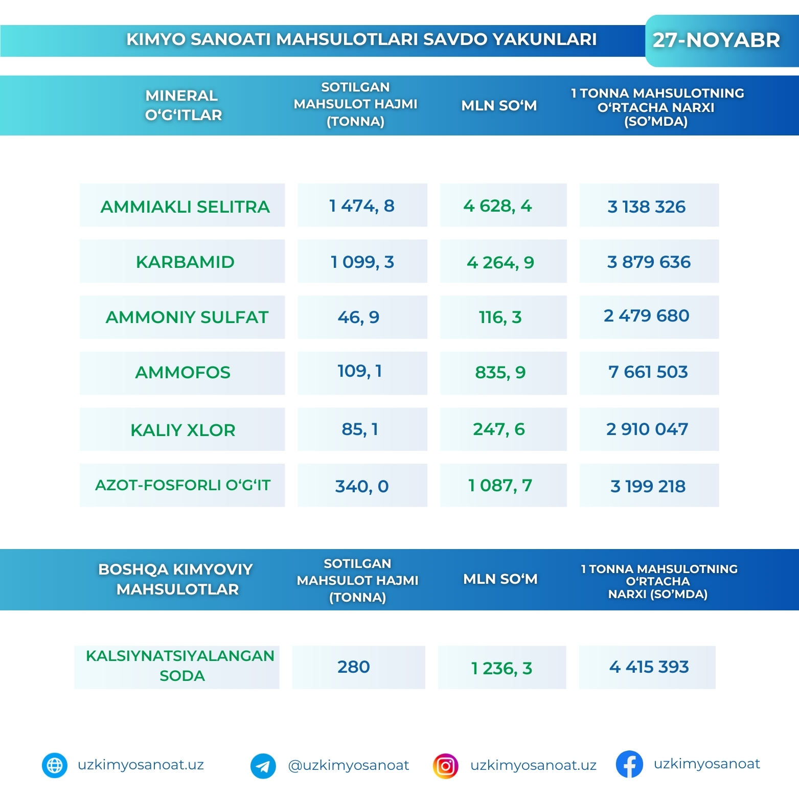 Ўзбекистон Республика товар-хом ашё биржасидаги кимё саноати маҳсулотларининг 27-ноябр кунидаги савдо якунлари
