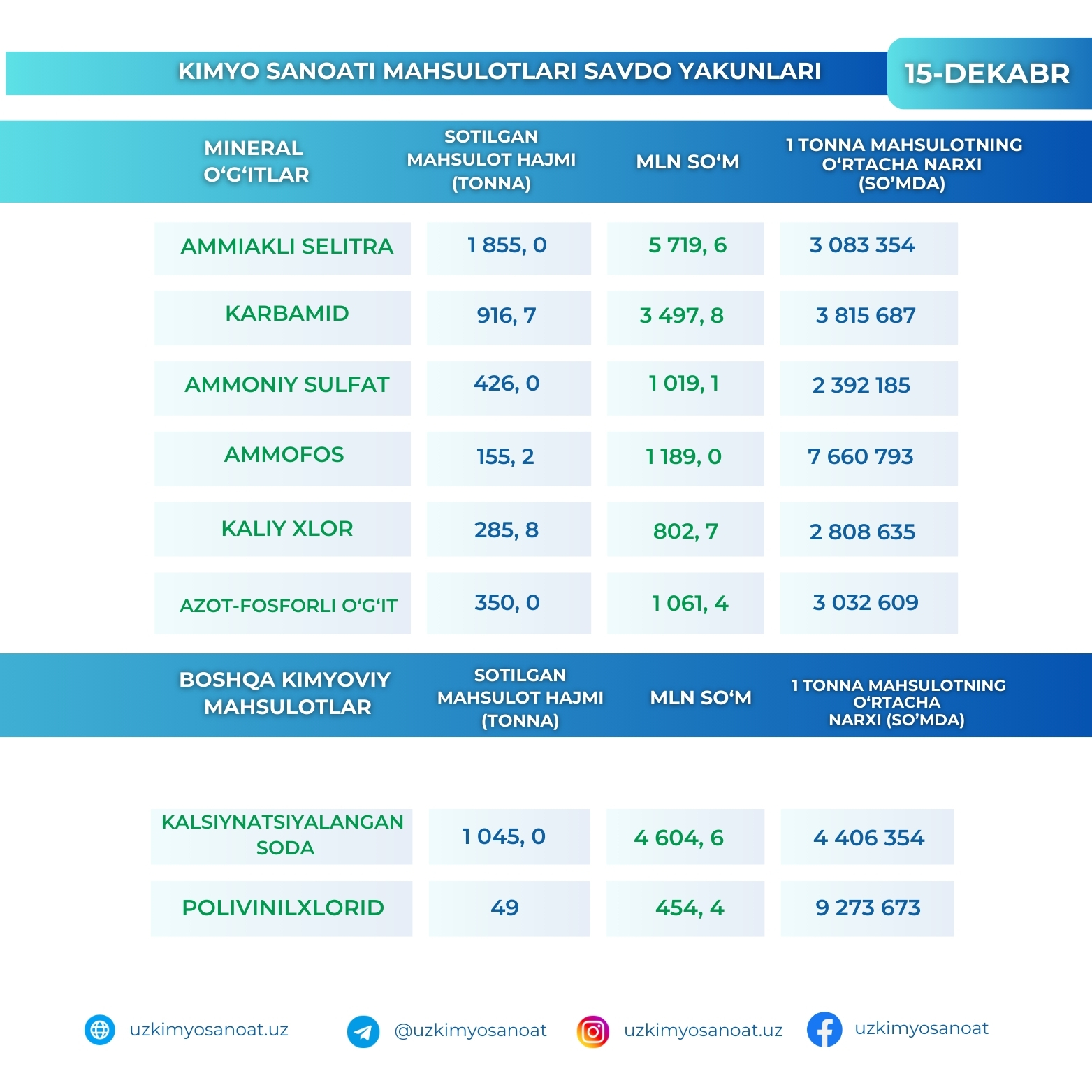 Ўзбекистон Республика товар-хом ашё биржасидаги кимё саноати маҳсулотларининг 15-декабр кунидаги савдо якунлари