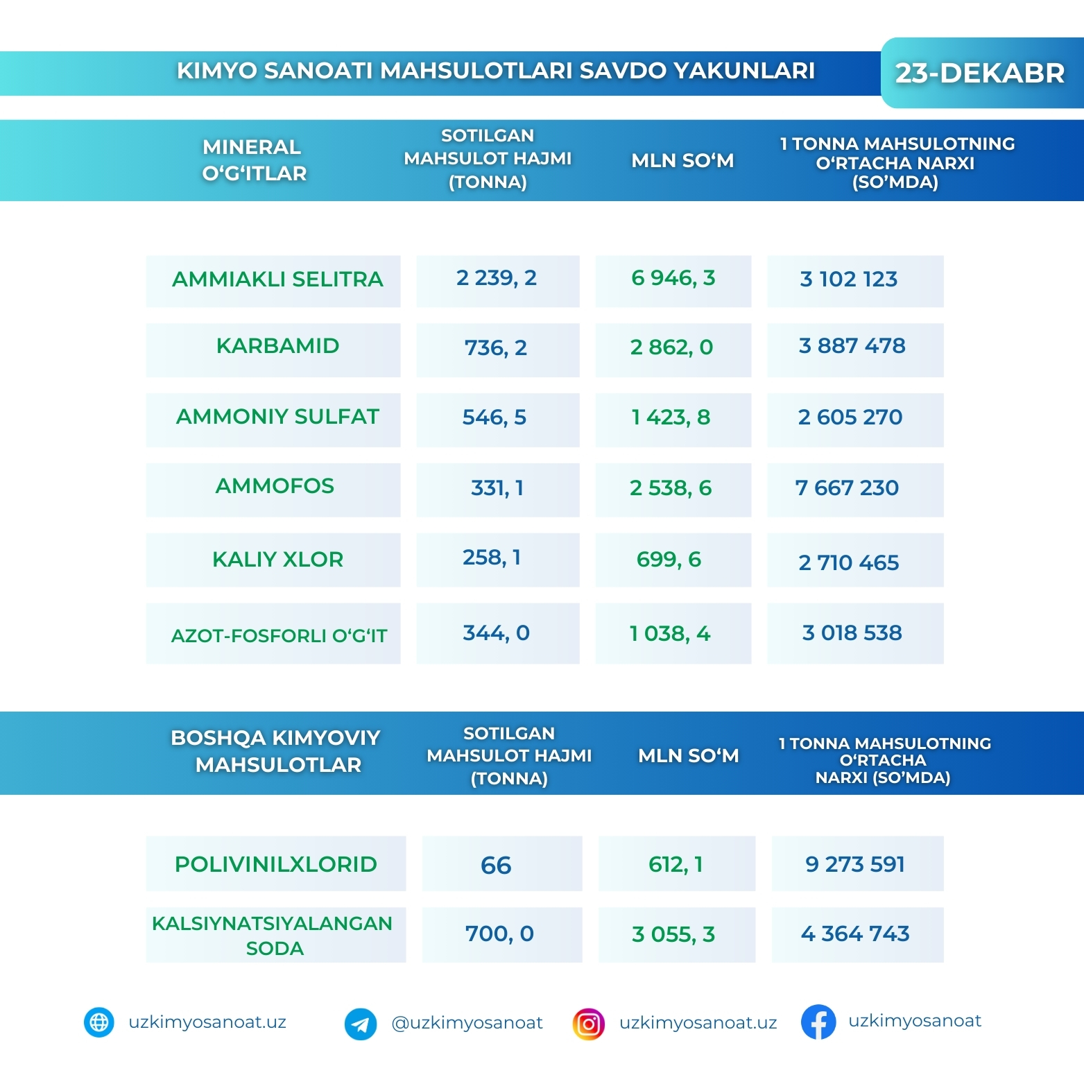 Ўзбекистон Республика товар-хом ашё биржасидаги кимё саноати маҳсулотларининг 23-декабр кунидаги савдо якунлари