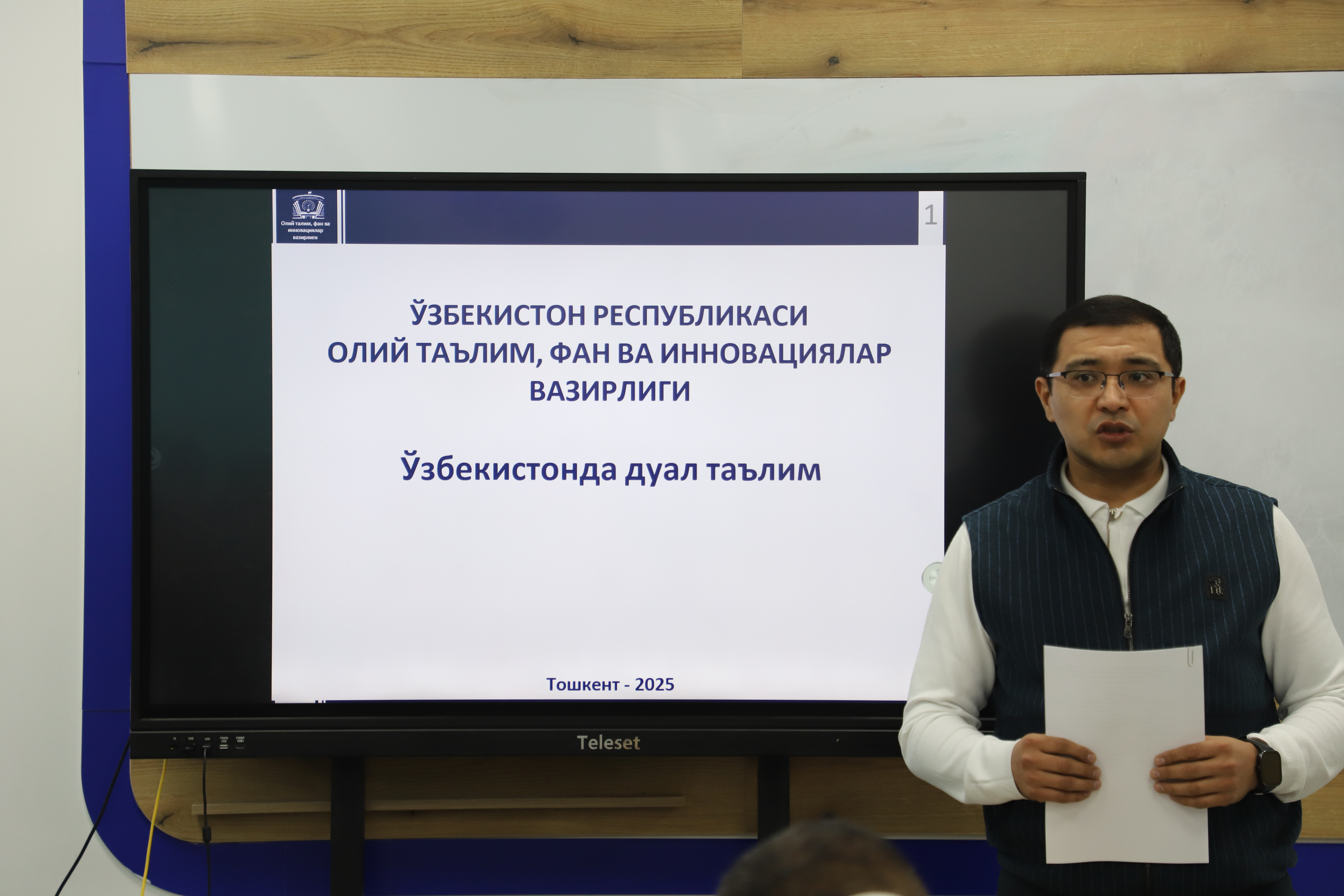 Тадбир доирасида иштирокчиларга дуал таълим тизимини самарали жорий этиш ва ривожлантириш бўйича илғор тажрибалар тақдим этилади.
