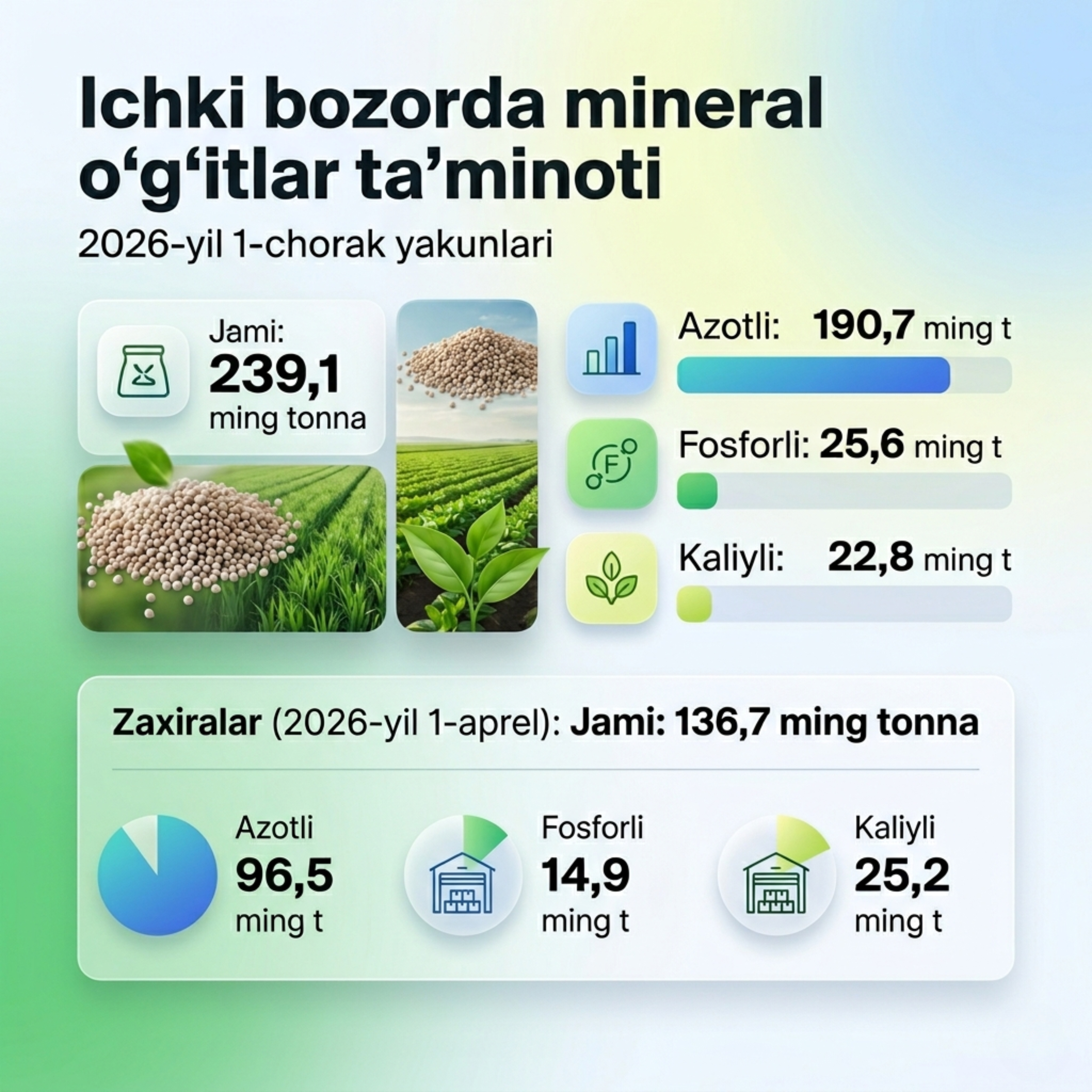 Мавжуд захиралар баҳорги дала ишларини узлуксиз олиб бориш, фермер ва деҳқон хўжаликларини ўз вақтида минерал ўғитлар билан таъминлаш имконини беради. Шу билан бирга, биржа савдолари орқали очиқ ва шаффоф тақсимот механизмининг йўлга қўйилгани бозор барқарорлигини таъминлашда муҳим омил бўлиб хизмат қилмоқда. Келгуси ойларда ҳам минерал ўғитлар ишлаб чиқариш ва етказиб бериш ҳажмларини ошириш, захираларни мунтазам тўлдириб бориш бўйича тегишли чора-тадбирлар амалга оширилмоқда. Бу эса қишлоқ хўжалигида юқори ҳосилдорликка эришиш ва озиқ-овқат хавфсизлигини таъминлашда муҳим аҳамият касб этади.
