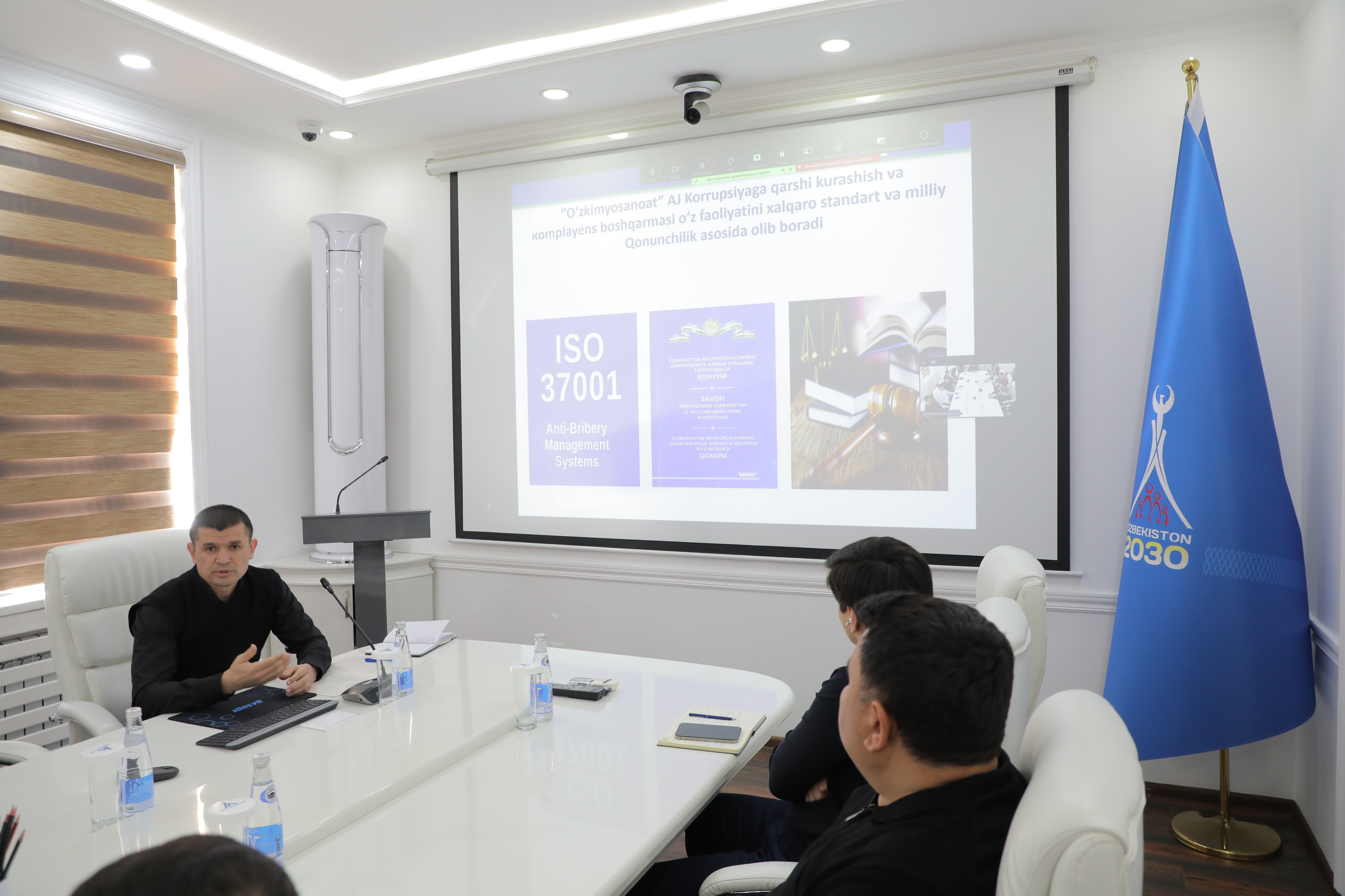 Шунингдек, ходимларга “Ўзкимёсаноат” АЖда вакант лавозимларга номзодларни ишга олиш, давлат харидларини ўтказиш, пул операцияларини амалга ошириш жараёнида манфаатлар тўқнашувини олдини олиш бўйича ташкилот раҳбарияти ва “Комплаенс-назорат” тузилмалари томонидан олиб борилаётган тизимли ишлар, қабул қилинаётган ички меъёрий ҳужжатлар ва чора-тадбирлар ҳақида маълумот берилди.
