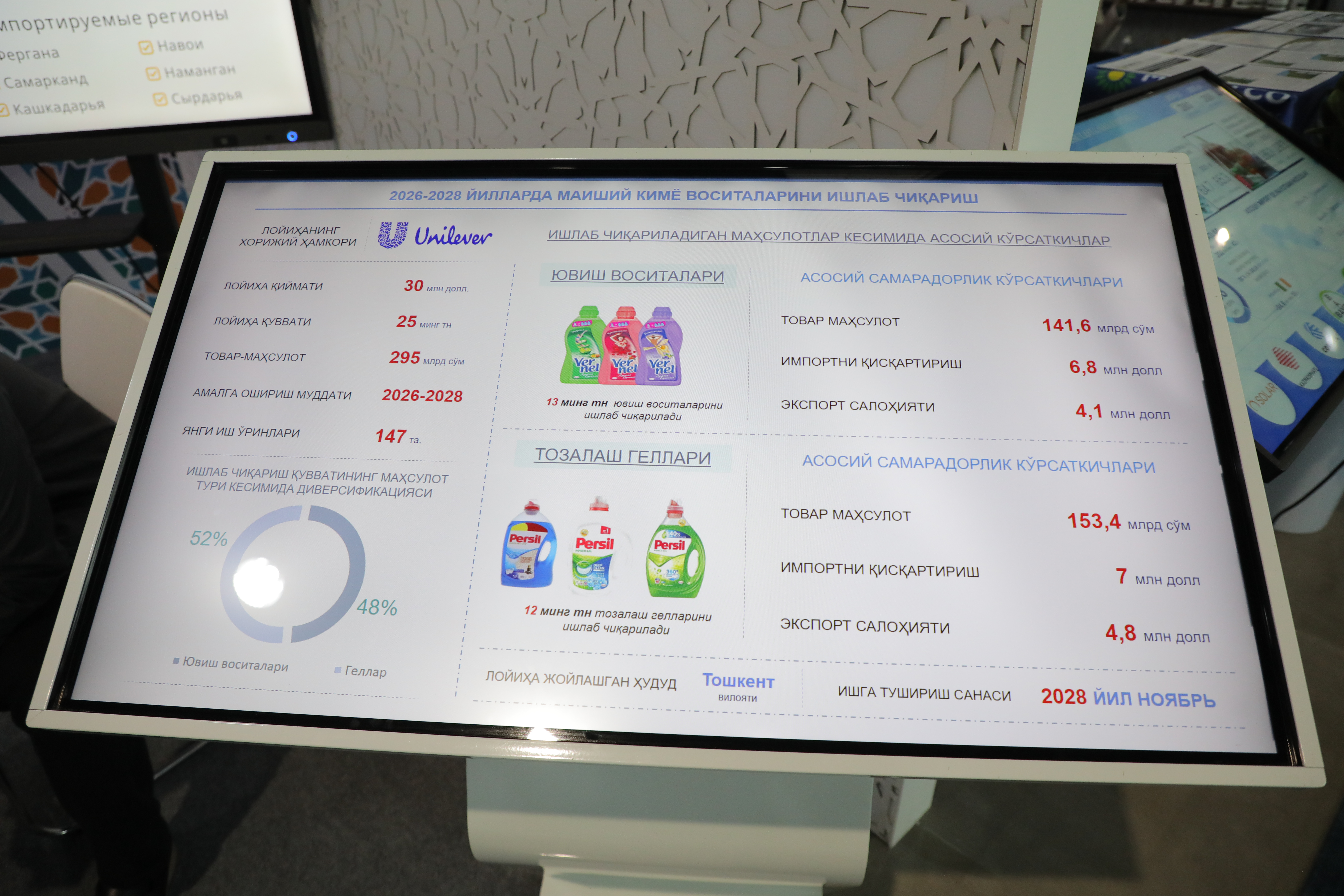 Хусусан, “Ўзкимёсаноат” АЖ тармоқ корхоналари томонидан ҳам 30дан ортиқ импорт қилинаётган маҳсулотлар ҳамда доимий импорт қилинаётган материаллар ва бутловчи қисмлар ўзлаштириш учун намойиш қилинмоқда. Кимё саноати маҳсулотлари, парфюмерия, косметика ва шахсий гигиена воситалари, шунингдек, маҳаллийлаштириш дастури ва саноат кооперация алоқалари доирасида импортни оптималлаштириш борасида олиб борилаётган амалий ишлар тўғрисидаги тақдимот материаллари тақдим қилинмоқда.